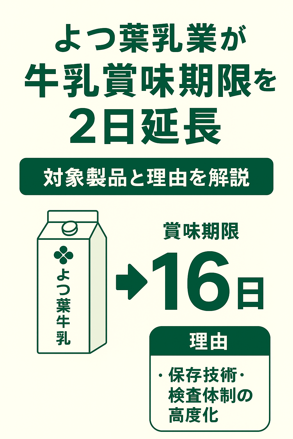 乳製品 よつ葉乳業が牛乳賞味期限を2日延長|対象製品と理由を解説 よつ葉乳業は2025年10月から牛乳など10品目の賞味期限を14日→16日に延長。ESL等の技術で品質を維持し食品ロス削減を目指します。対象製品や保存上の注意点、流通への影響を分かりやすく解説。 2025.10.03 乳製品酪農酪農NEWS酪農関連企業・組織